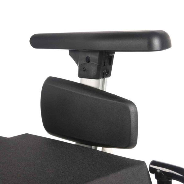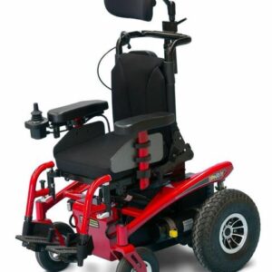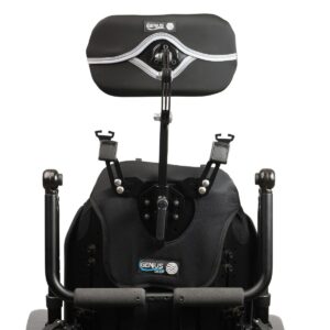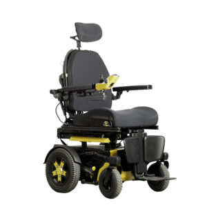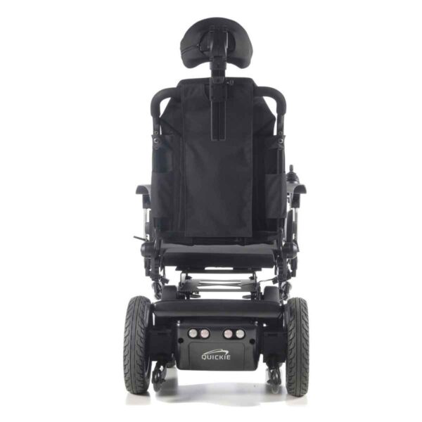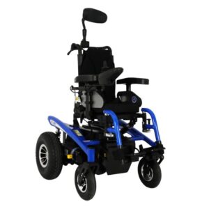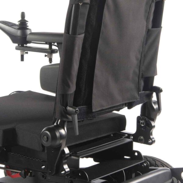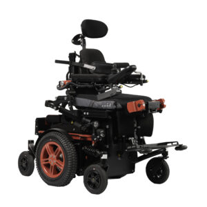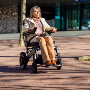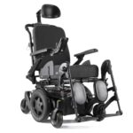 Carrozzina elettrica pieghevole a trazione posteriore, combinata con seduta Sedeo Lite multi-regolabile per uso domestico e all’aperto.