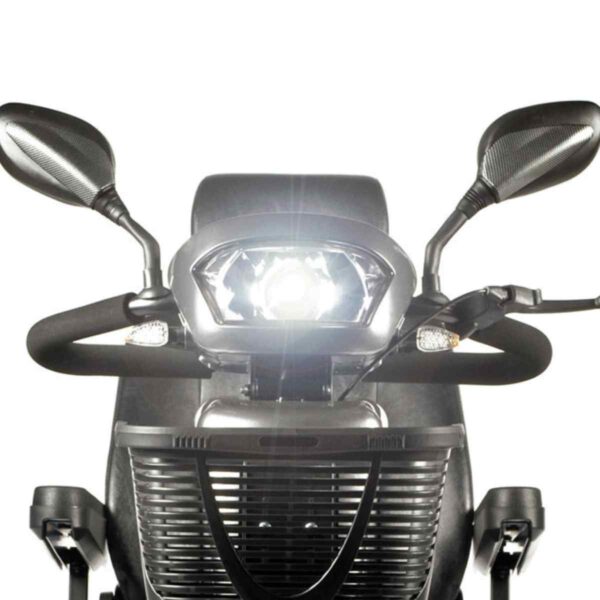 Le sospensioni regolabili su tutte le ruote, il sedile girevole con schienale reclinabile e le ruote pneumatiche da 33 cm permettono una guida fluida anche su terreni sconnessi. L’impianto luci full LED ad alta visibilità e i comandi ergonomici completano un ausilio pensato per chi cerca indipendenza e prestazioni elevate.